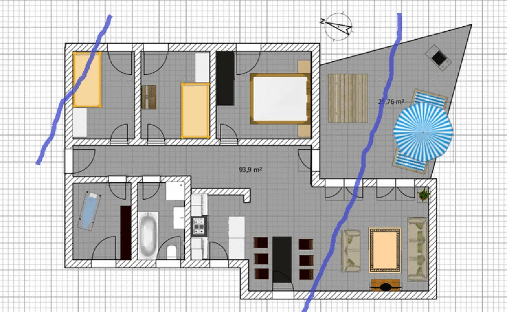 Familie W. hat zwei Kinder und bei einem der Kinder wurde ein auffälliges Verhalten diagnostiziert. Die Eltern haben mich beauftragt, den Schlafplatz des auffälligen Kindes sowie die ganze Wohnung auf geomantische Faktoren zu untersuchen. Hierbei ist diese Skizze entstanden, aus der deutlich die beiden Wasseradern zu entnehmen sind, die durch die Wohnung fließen.